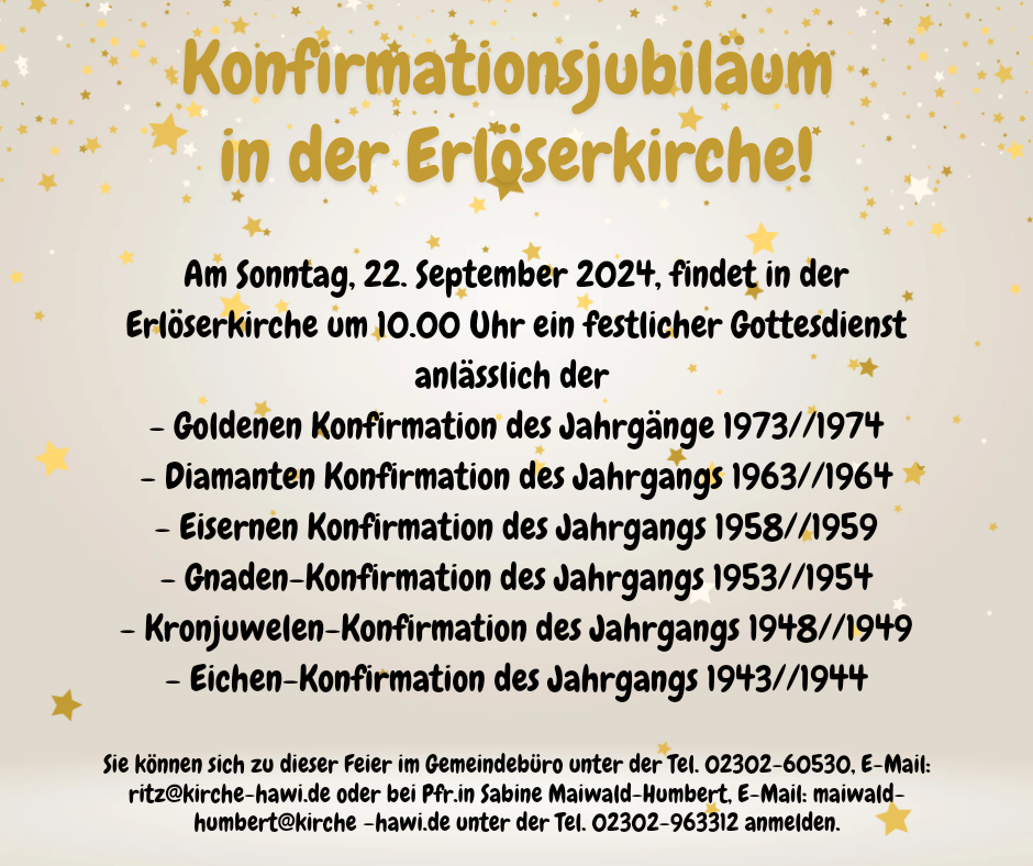 Jubelkonfirmation, 22.09.2024 in der Erlöserkirche Jubelkonfirmation, 22.09.2024 in der Erlöserkirche News Jubelkonfirmation, 22.09.2024 in der Erlöserkirche bsadmin2024-07-30T09:53:21+02:0030. Juli. 2024|News| Weiterlesen