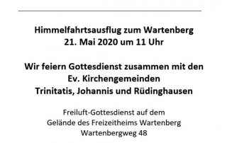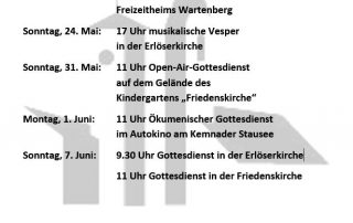 - Himmelfahrt, 21. Mai: 11 Uhr Open-Air-Gottesdienst auf dem Gelände des Freizeitheims Wartenberg