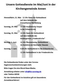 Unsere Gottesdienste im Mai/Juni in der Kirchengemeinde Annen