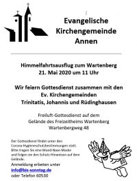 - Himmelfahrt, 21. Mai: 11 Uhr Open-Air-Gottesdienst auf dem Gelände des Freizeitheims Wartenberg